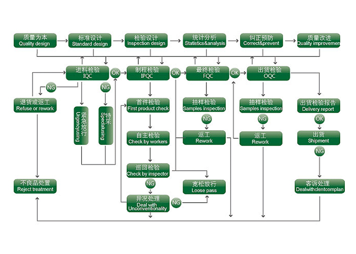 Our company has always adhered to the requirements of the ISO9001 quality management system. From prototype development to mass production, we implement data-driven and systematic management. Our R&D team uses PDM management software, while sales, purchasing, production, and warehousing use an ERP system to manage data. Quality control is strictly implemented according to AQL standards at every stage to ensure we can provide our customers with satisfactory products and services.