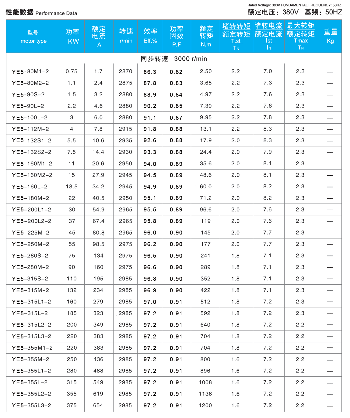 YE5 series premium efficiency three-phase asynchronous motor with the mounting dimension in accordance with standard IEC60034,It has good features like optimum structure,attractive appearance,low noise,high efficiency,high protection class as well as high insulation class.YE5 series premium efficiency three-phase asynchronous motor can be widely used in various kinds of general use machineries like fans,pumps,machin tools,compressors,transportation and so on,and can also be used in the hazardous areas with oil and chemical,steel plants,mining industry.